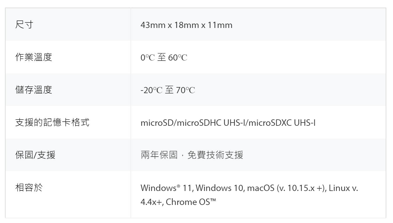 microSD/SDHC/SDXC、UHS-I 並支援最新的記憶卡速度。其提供兩年保固、免費技術支援服務及 Kingston® 可靠的品質保證。