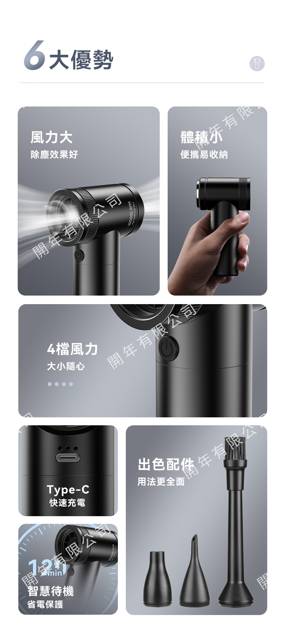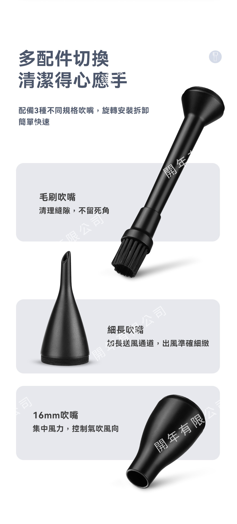 .配備三種不同吹嘴,毛刷、細長、16mm吹嘴