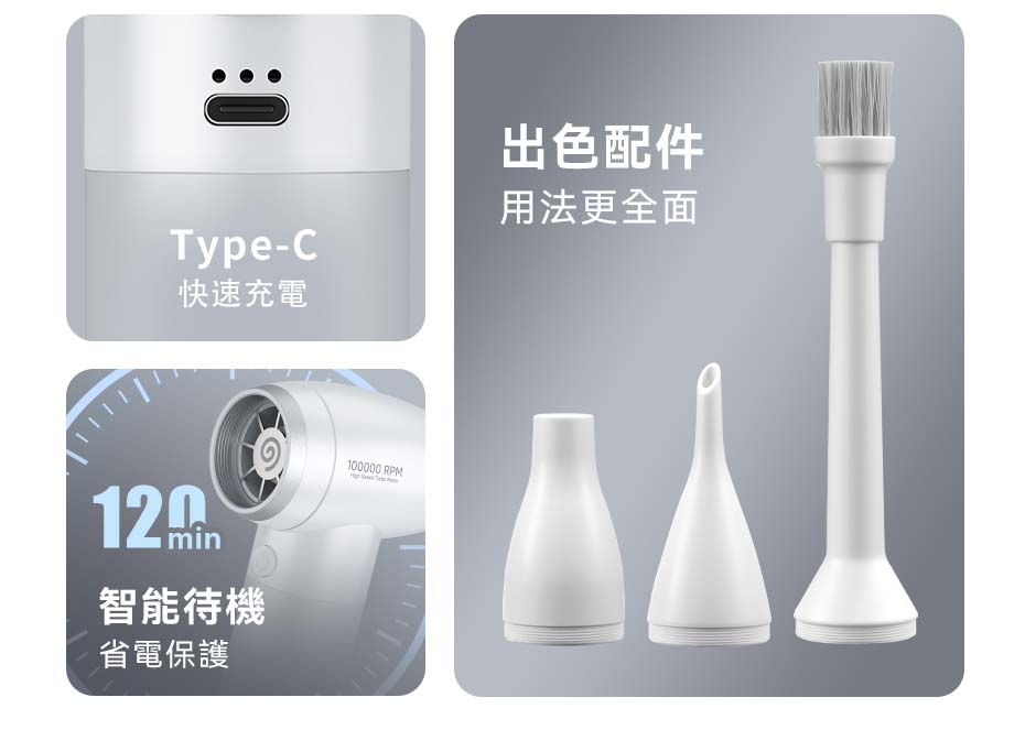 .配備三種不同吹嘴,毛刷、細長、16mm吹嘴
