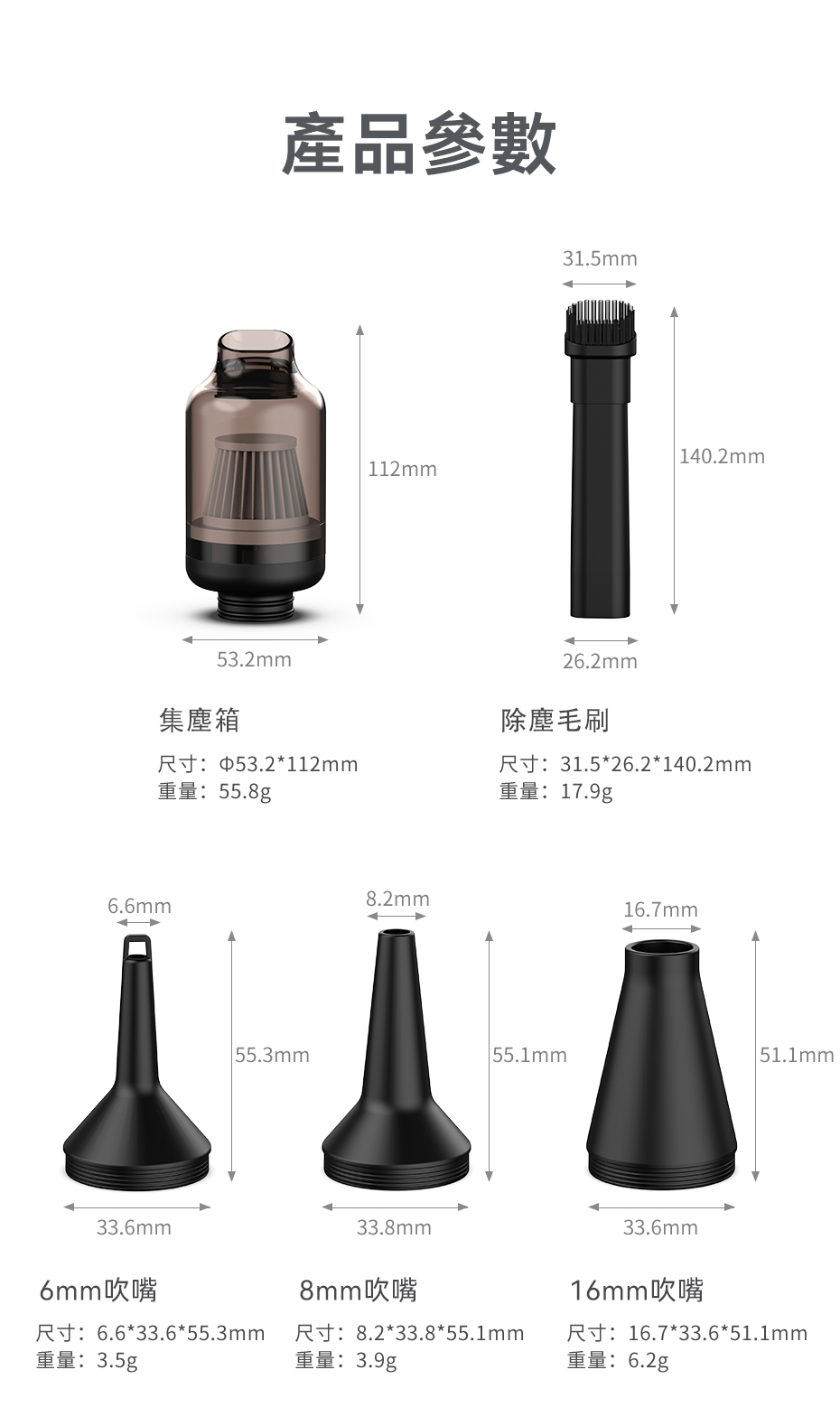 //標配 1x 集塵盒 1x 除塵毛刷 1x 6mm吹嘴 1x 8mm吹嘴 1x 16mm吹嘴