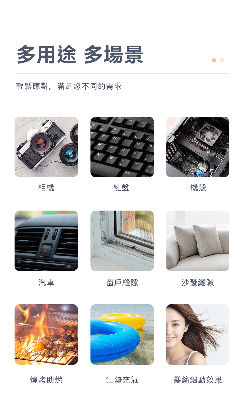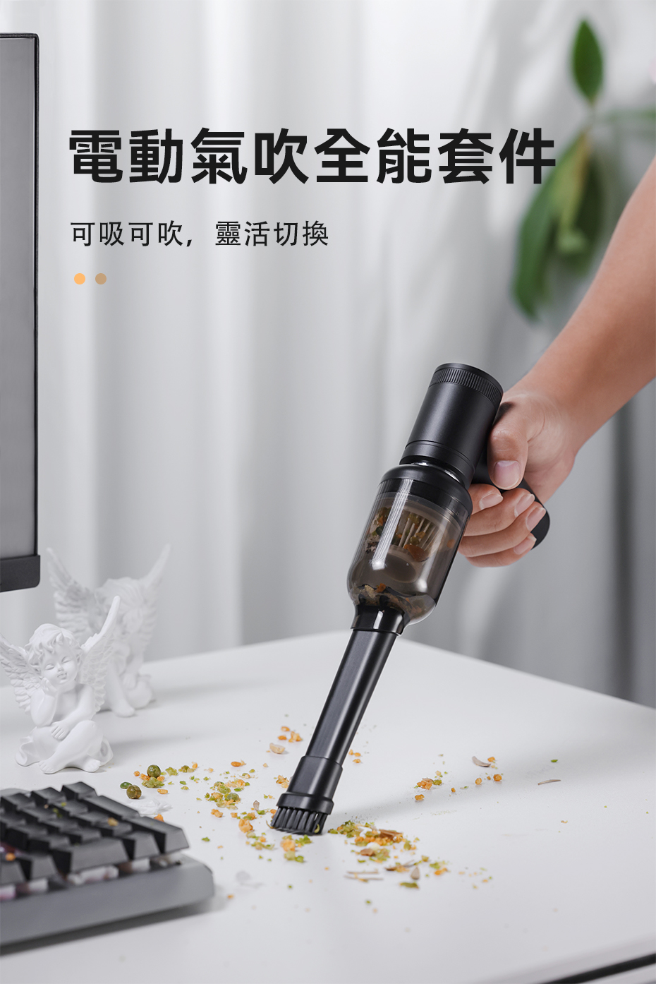 .帶有不同大小吹嘴,可替氣球、泳圈、充氣玩具、充氣床等進行充氣 .旋轉安裝拆卸,快速簡潔 .可吹可吸,帶有除塵毛刷和集塵盒,可作為吸塵器使用